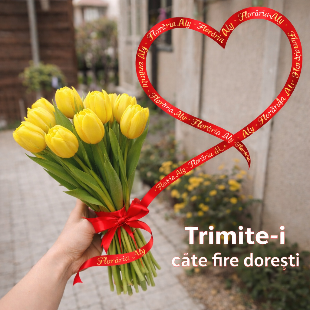 Buchetul este realizat din lalele atent selecționate, legate cu panglică satinată personalizată Florăria Aly, pentru un plus de eleganță și identitate.