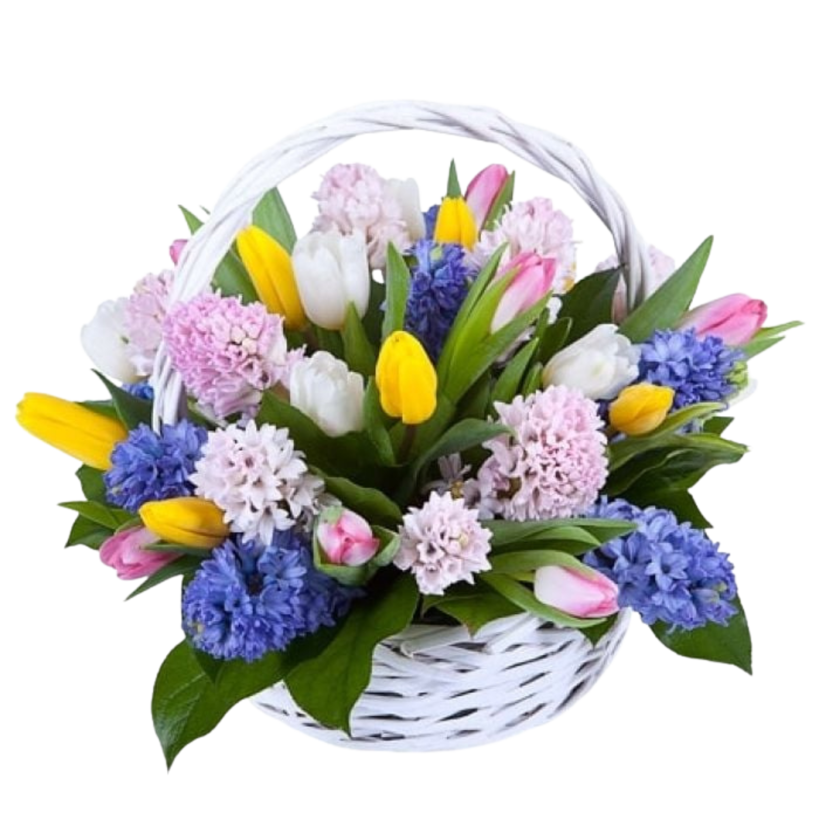 Un aranjament plin de prospețime și culoare, cu lalele delicate și zambile parfumate, atent aranjate într-un coș decorativ. Perfect pentru a aduce bucurie, primăvară și parfum într-un cadou special sau pentru a înfrumuseța orice spațiu.