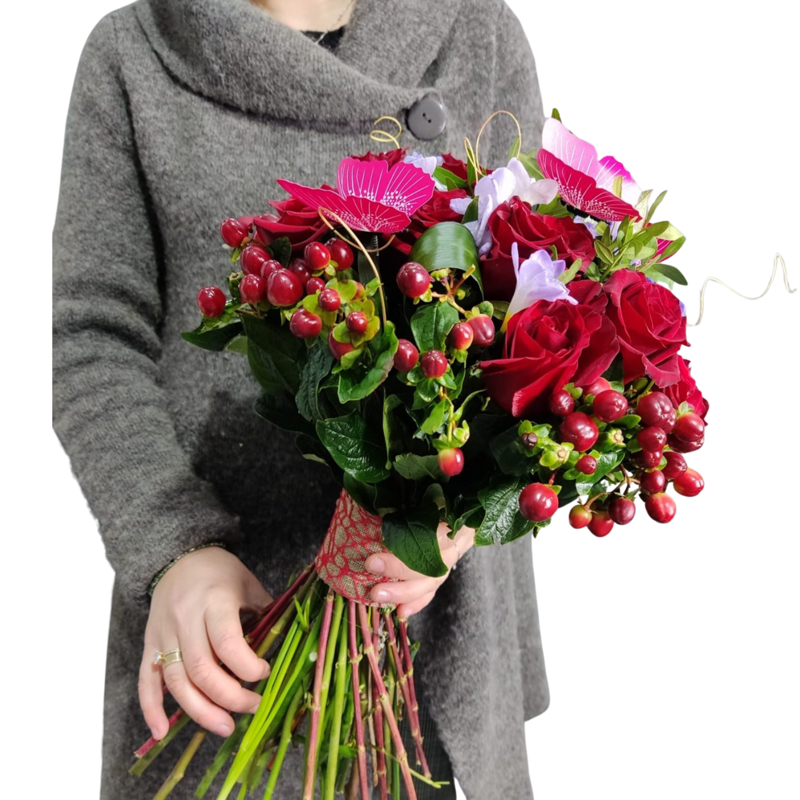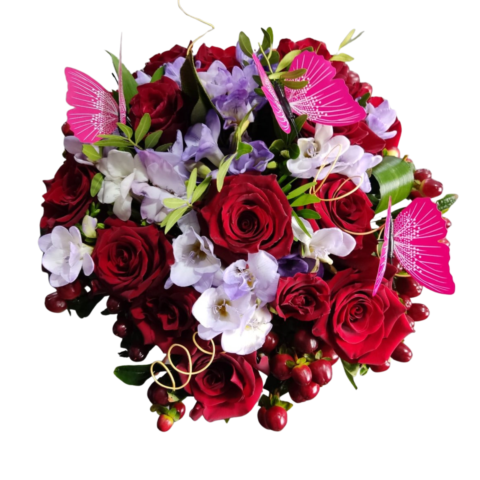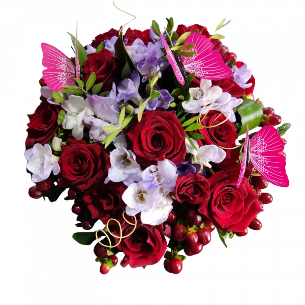 • Standard: buchetul conține 15 trandafiri roșii, 16 frezii, 15 hypericum, mix verdeață, 3 fluturi, 2 ambalaj decorativ, 1 panglică.