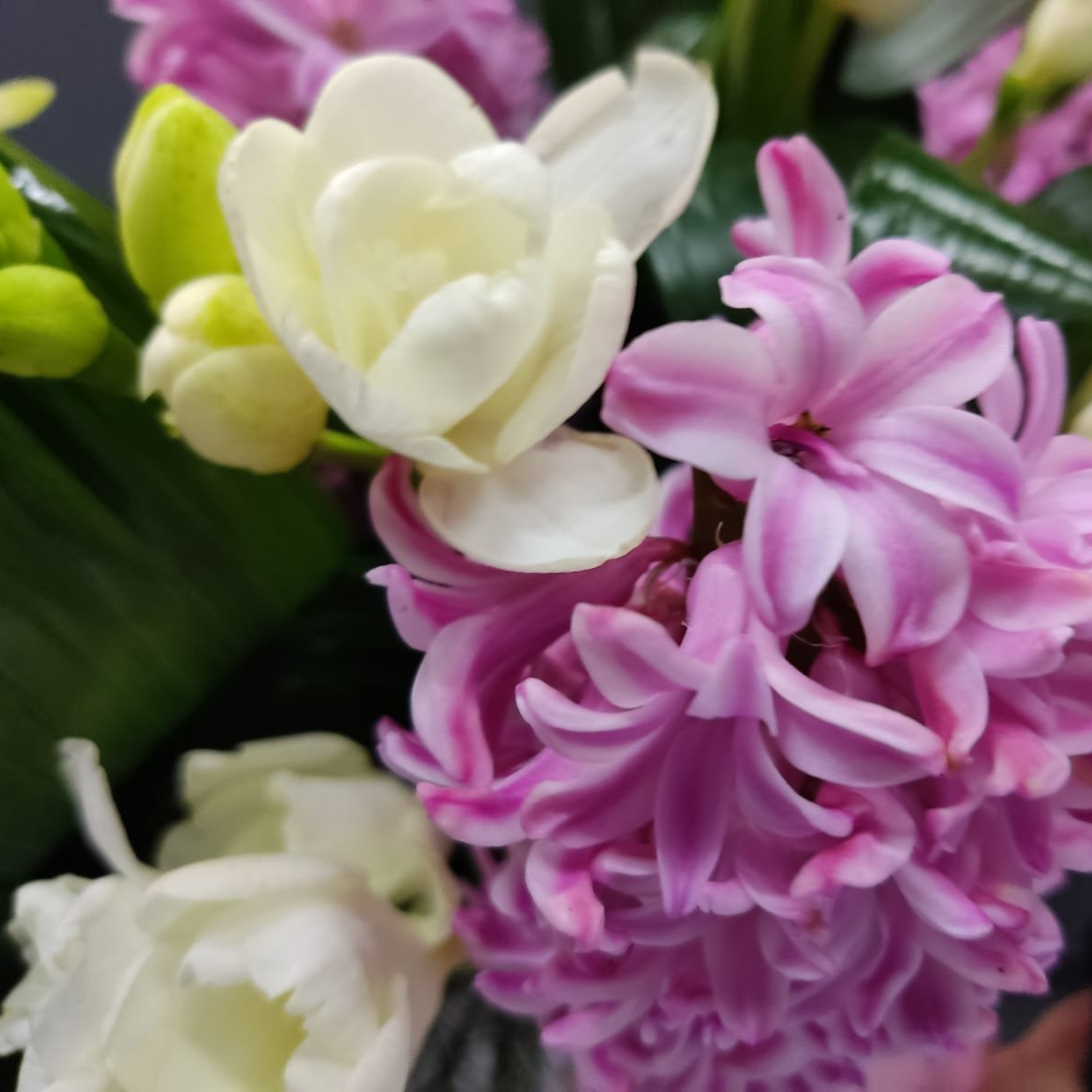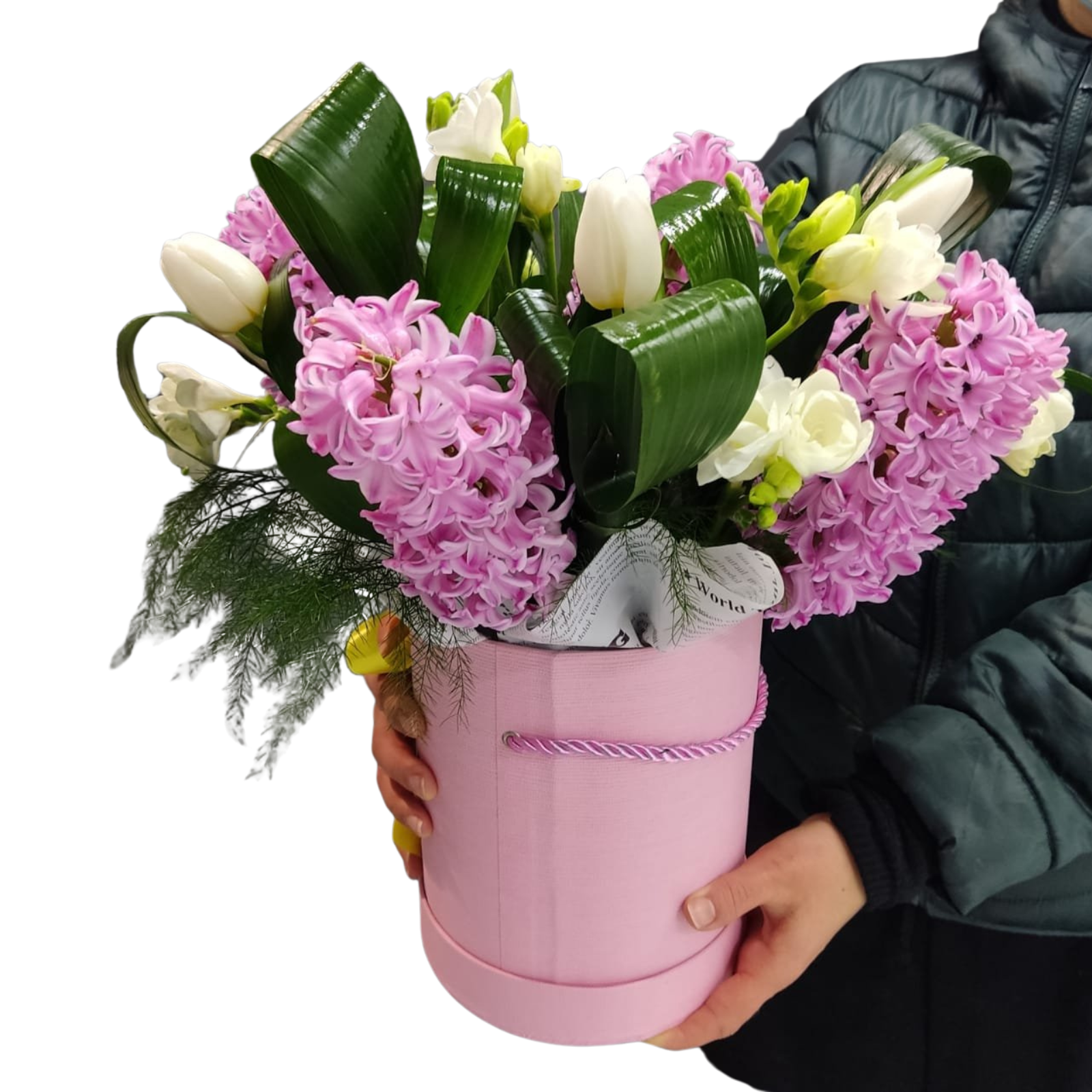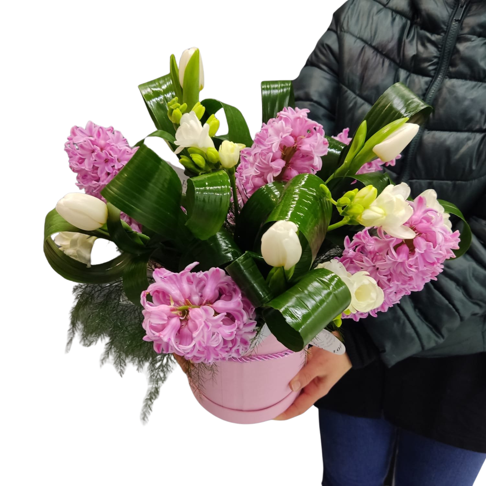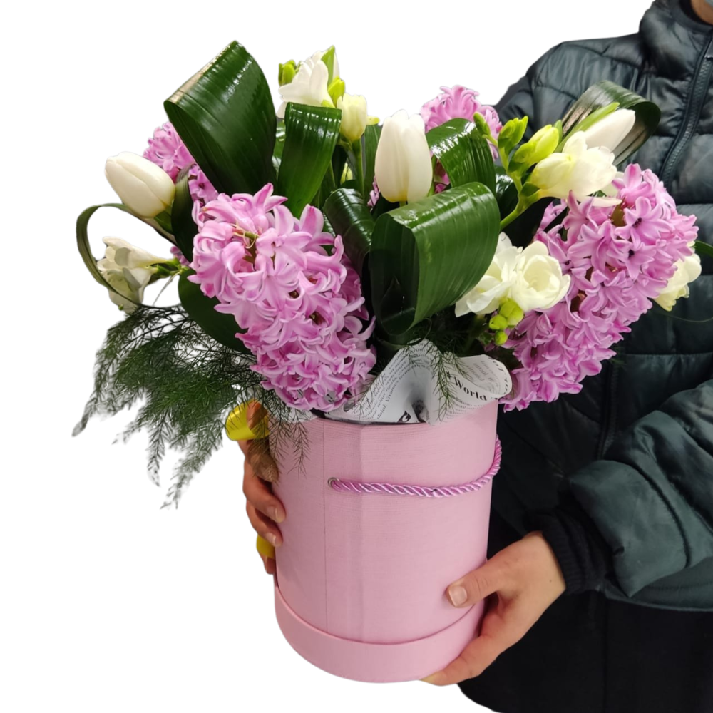 O compoziție florală vibrantă, în care parfumul îmbietor al zambilelor și freziilor se îmbină cu eleganța clasică a lalelelor, totul accentuat de frunzele decorative de aspidistra. Aranjamentul este montat într-o cutie cilindrică sofisticată, cu burete floral hidratat, ce menține prospețimea florilor zile întregi.