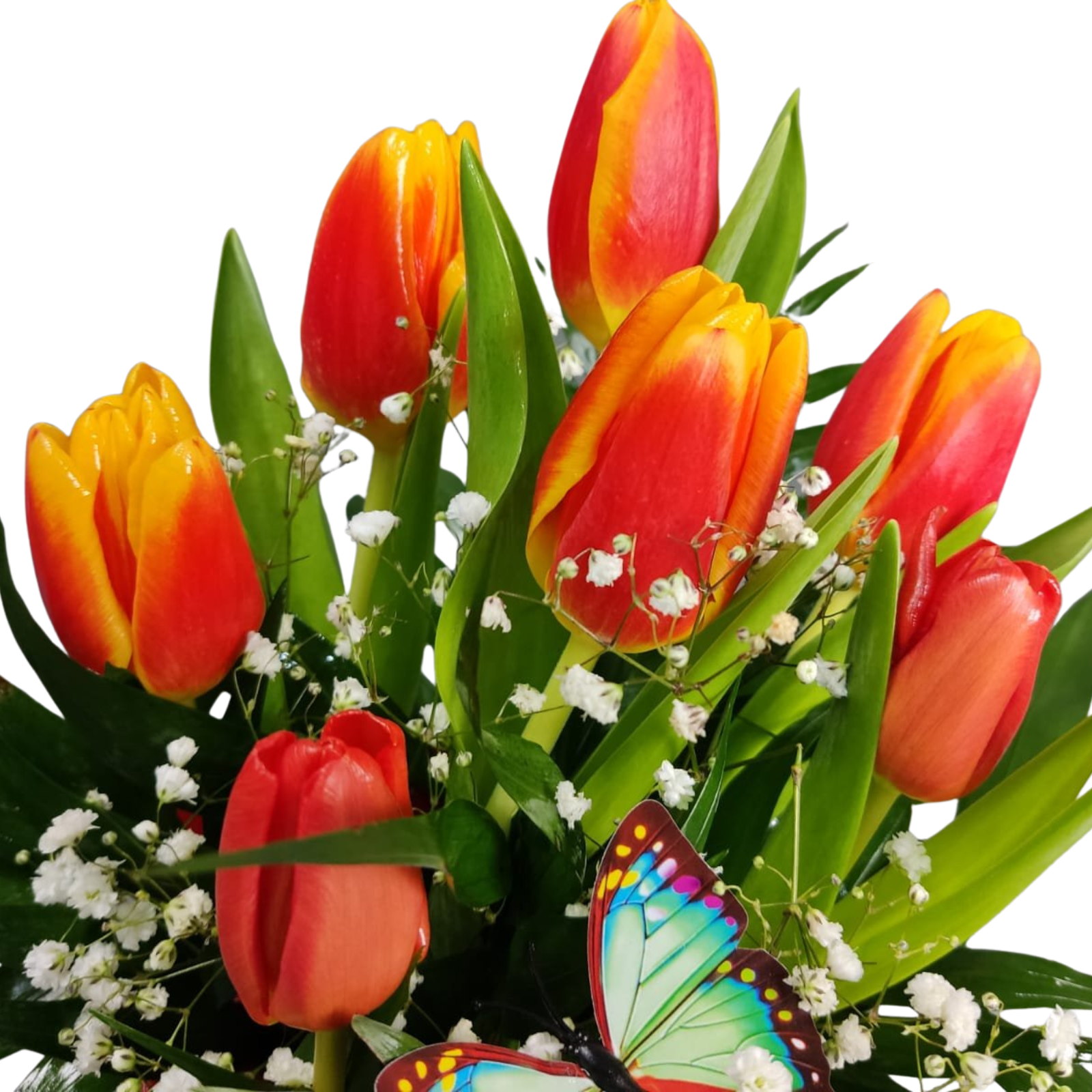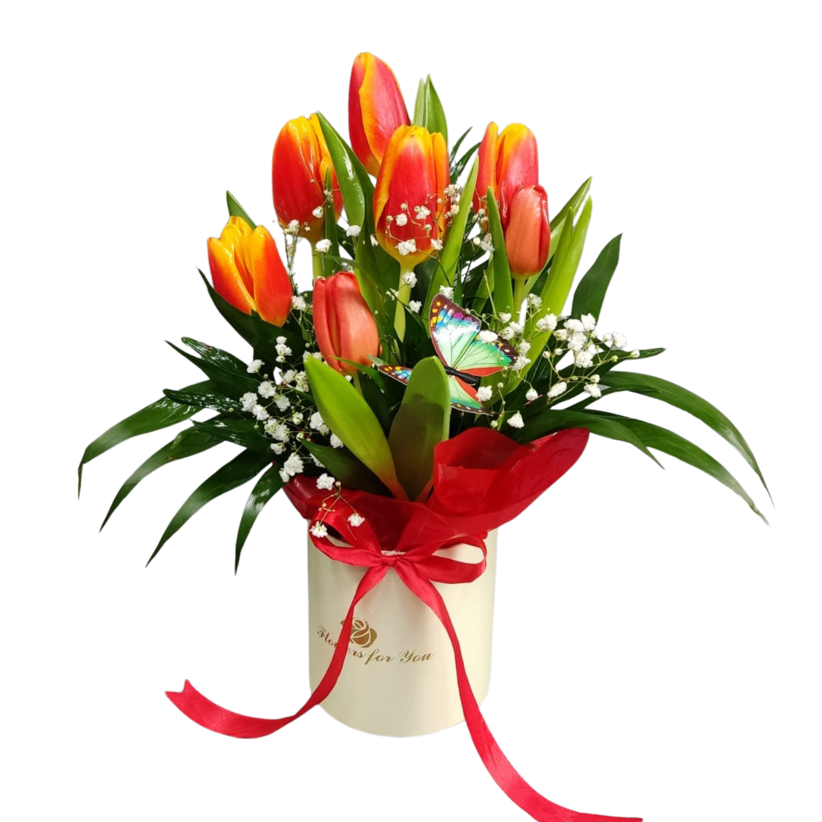 Varianta Standard: 7 lalele, 1 gypsophila, 5 cico jumbo, 1 fluture, 1 cutie cilindru mică, 1 folie, 1 burete floral, 1 panglică.