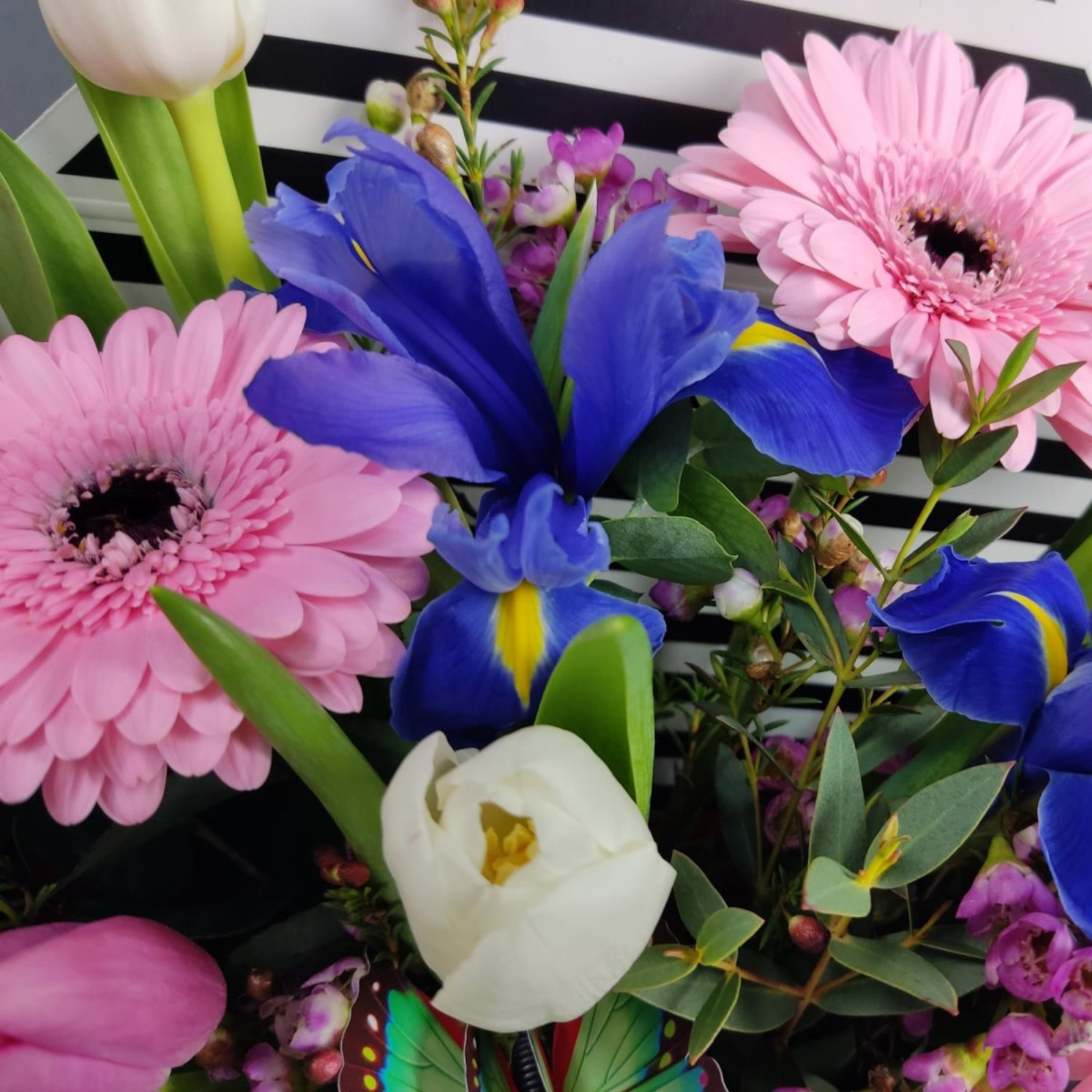 Un aranjament vesel și colorat, cu lalele delicate, iriși eleganți și minigerbere pline de energie, așezate într-un plic decorativ. Ideal pentru a dărui bucurie și prospețime în orice ocazie.