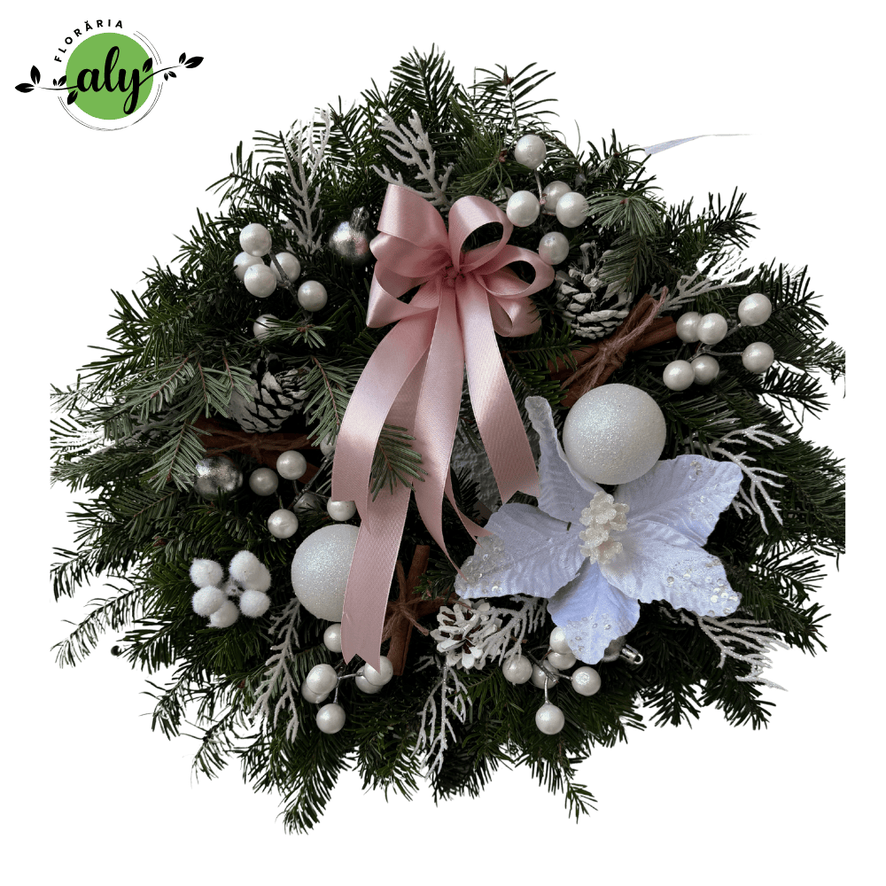 Această coroniță de ușă îmbină armonios tonurile pure cu un accent subtil de roz pal, fiind alegerea perfectă pentru un decor rafinat și luminos sau un cadou special.