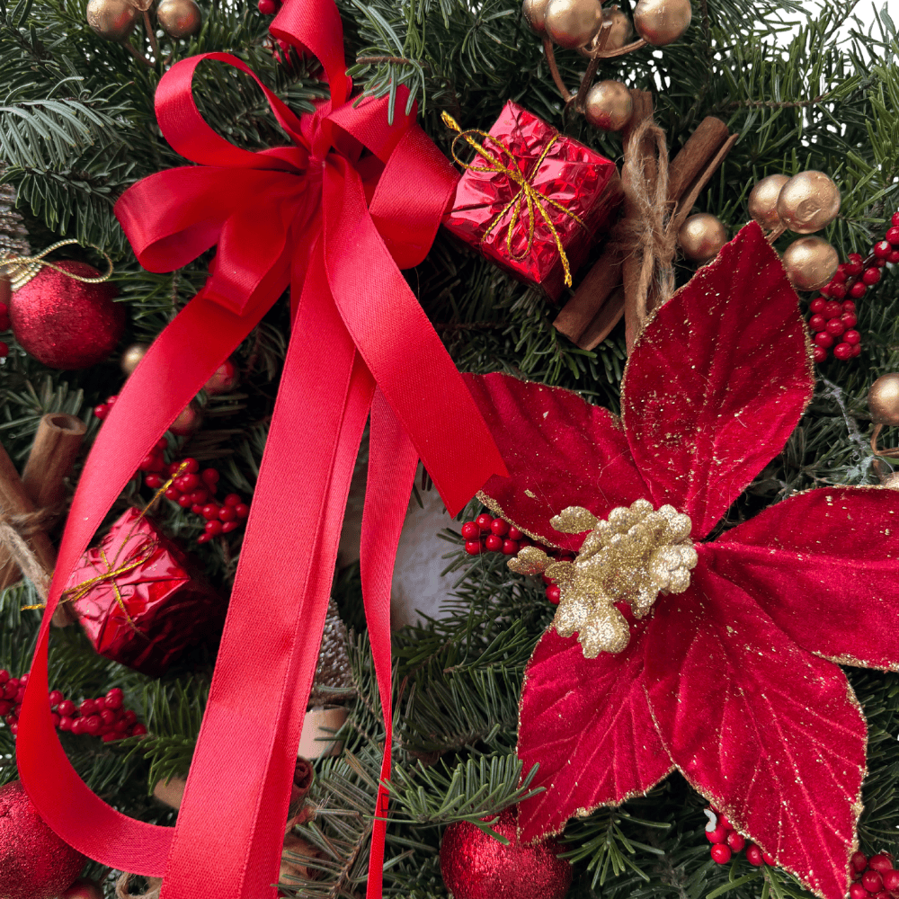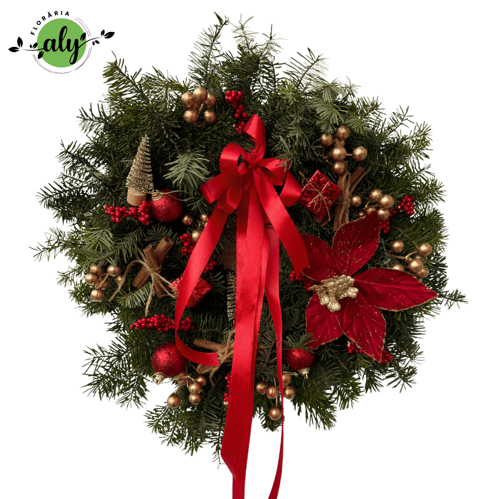 Adaugă un strop de magie și prospețime naturală sărbătorilor cu această coroniță realizată din brad natural, atent împletită și decorată manual în atelierul Florăria Aly. Tonurile vibrante de roșu se îmbină perfect cu verdele intens al bradului, oferind un decor clasic, cald și festiv.