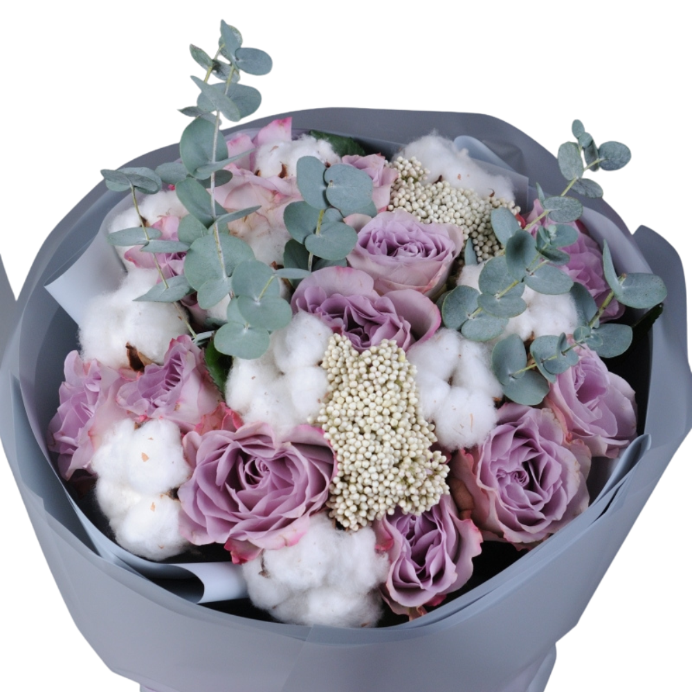 Un buchet sofisticat și modern, realizat în nuanțe reci și elegante. Trandafirii mov Ocean Song aduc o frumusețe delicată și aparte, alliumul oferă structură și un accent contemporan, florile de mătase completează armonios textura, iar eucaliptul adaugă prospețime și un parfum subtil. Un aranjament potrivit pentru momente speciale, dar și pentru cadouri rafinate care transmit stil și eleganță.