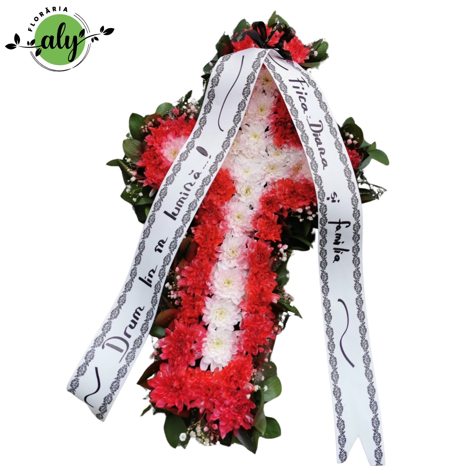 Această jerbă funerară în formă de cruce îmbină simbolistica purității și a iubirii veșnice, prin contrastul delicat dintre alb și roșu.