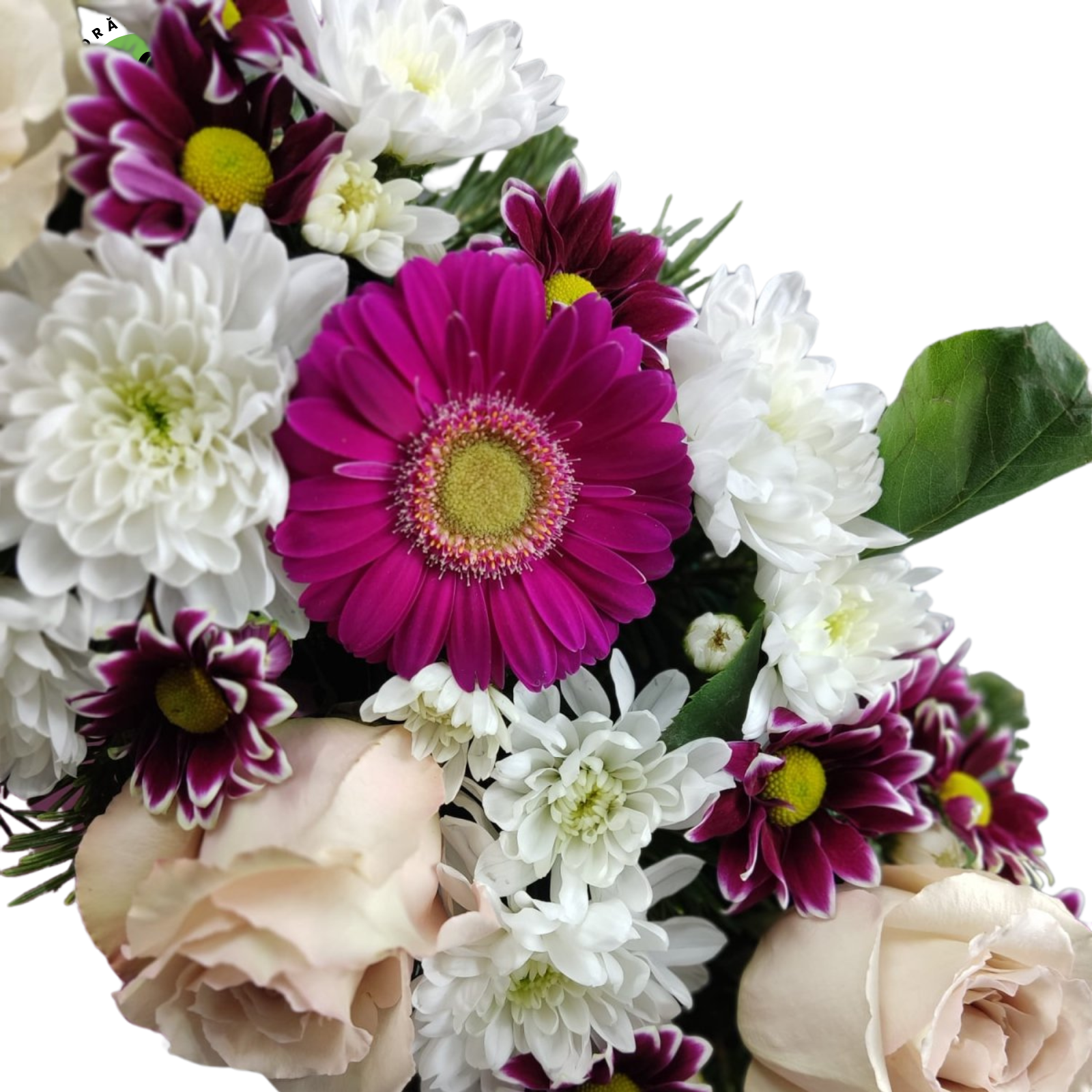 • 8 trandafiri, 1 crin imperial, 6 minigerbera, 10 crizanteme, mix verdeață de sezon, cadru de polistiren cu picior + burete floral diametru aproximativ 50 cm