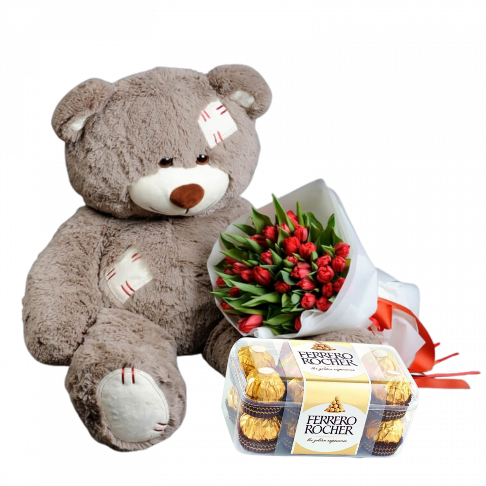 Standard: buchetul conține 35 lalele roșii, 3 ambalaj decorativ, 1 panglică! Urs pluș 100 cm, Pralinne Ferrero RocherCauți o surpriză specială pentru cineva care iubește florile? Acest buchet plin de culoare și emoție este alegerea ideală pentru a transmite dragoste, apreciere sau pur și simplu un gând frumos.