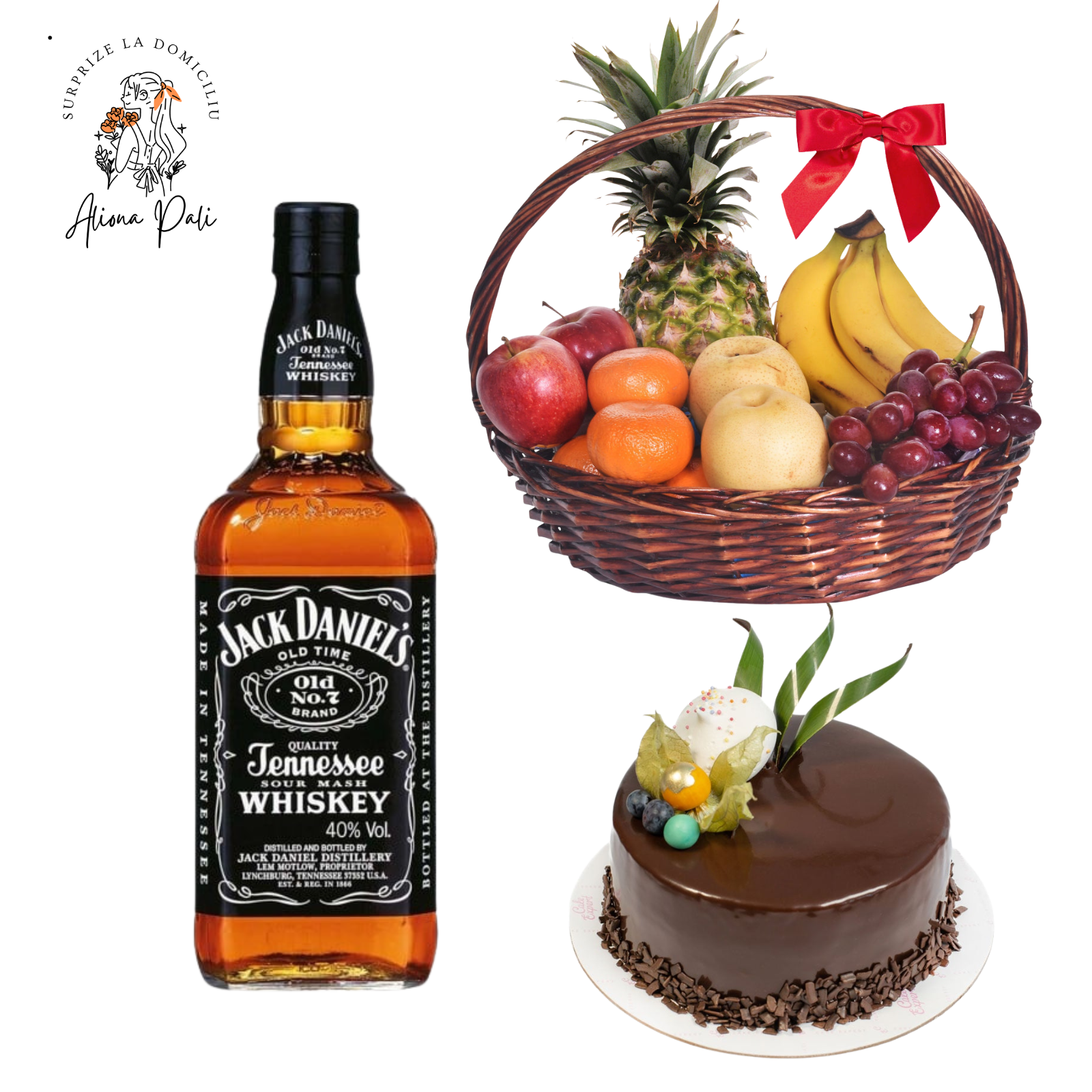 Pachetul „Surprize la domiciliu – Pachet 14” combină eleganța unui coș cu fructe, dulceața unui tort delicios și rafinamentul unei sticle de whisky, pentru o surpriză completă și apreciată.