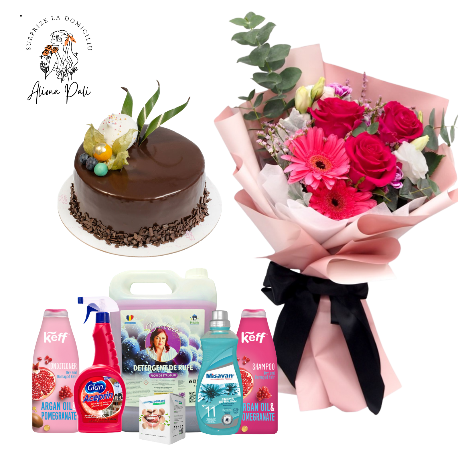 Oferă un cadou complet, practic și rafinat, care îmbină frumusețea florilor, dulceața tortului și utilitatea produselor de curățenie!